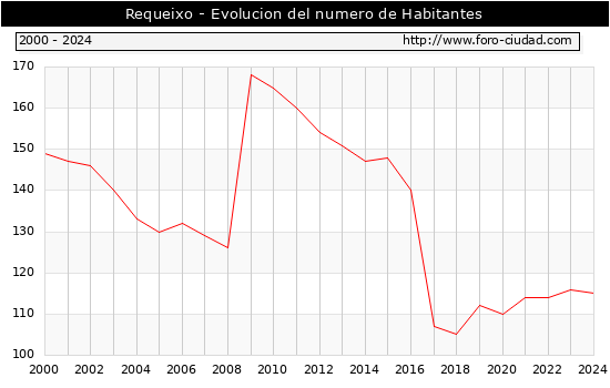 el numero de habitantes en Requeixo era de 115, 1 habitantes menos que el en el año 2023. En el grafico siguiente se puede ver cuantos habitantes tiene Requeixo a lo largo de los años.