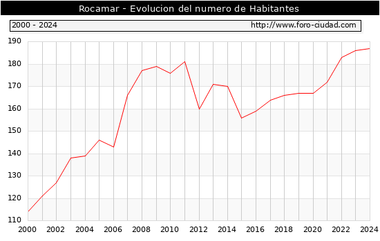 el numero de habitantes en Rocamar era de 187, 1 habitantes mas que el en el año 2023. En el grafico siguiente se puede ver cuantos habitantes tiene Rocamar a lo largo de los años.