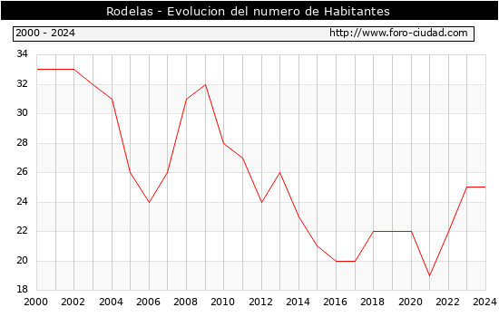 el numero de habitantes en Rodelas era de 25, igual numero de habitantes que el en el año 2023. En el grafico siguiente se puede ver cuantos habitantes tiene Rodelas a lo largo de los años.