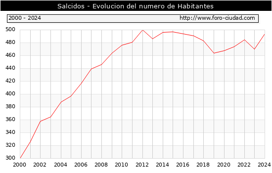 el numero de habitantes en Salcidos era de 494, 24 habitantes mas que el en el año 2023. En el grafico siguiente se puede ver cuantos habitantes tiene Salcidos a lo largo de los años.