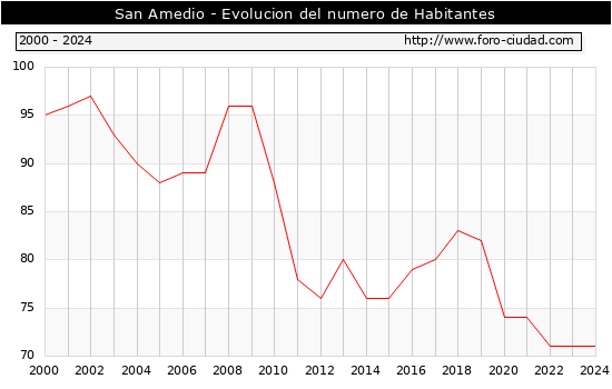 el numero de habitantes en San Amedio era de 71, igual numero de habitantes que el en el año 2023. En el grafico siguiente se puede ver cuantos habitantes tiene San Amedio a lo largo de los años.