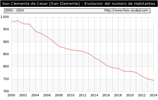 el numero de habitantes en San Clemente de Cesar (San Clemente) era de 745, 6 habitantes menos que el en el año 2023. En el grafico siguiente se puede ver cuantos habitantes tiene San Clemente de Cesar (San Clemente) a lo largo de los años.
