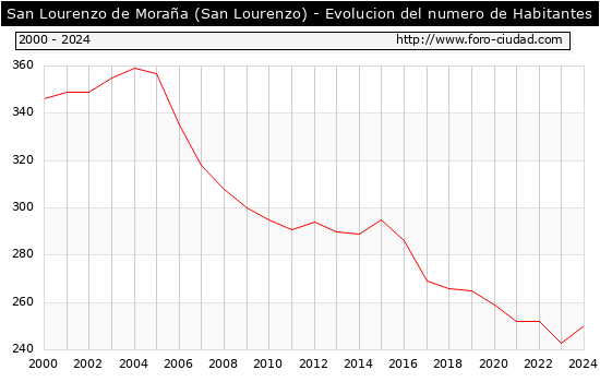 el numero de habitantes en San Lourenzo de Moraña (San Lourenzo) era de 250, 7 habitantes mas que el en el año 2023. En el grafico siguiente se puede ver cuantos habitantes tiene San Lourenzo de Moraña (San Lourenzo) a lo largo de los años.