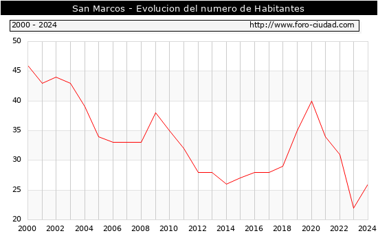 el numero de habitantes en San Marcos era de 26, 4 habitantes mas que el en el año 2023. En el grafico siguiente se puede ver cuantos habitantes tiene San Marcos a lo largo de los años.