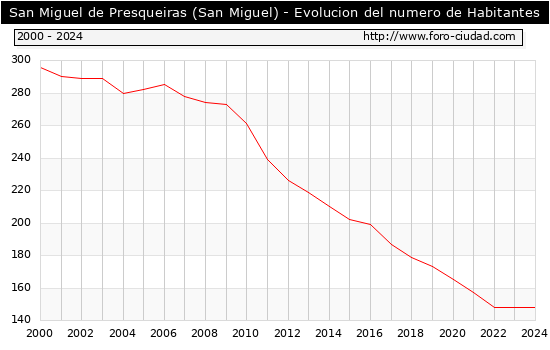 el numero de habitantes en San Miguel de Presqueiras (San Miguel) era de 148, igual numero de habitantes que el en el año 2023. En el grafico siguiente se puede ver cuantos habitantes tiene San Miguel de Presqueiras (San Miguel) a lo largo de los años.
