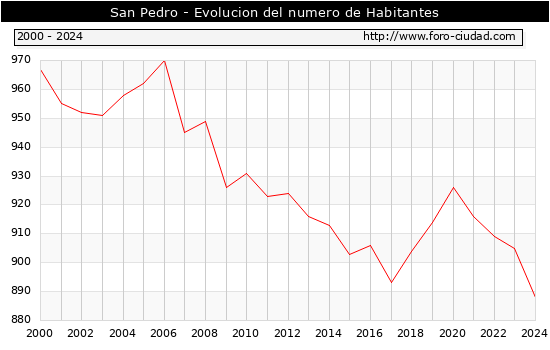 el numero de habitantes en San Pedro era de 888, 17 habitantes menos que el en el año 2023. En el grafico siguiente se puede ver cuantos habitantes tiene San Pedro a lo largo de los años.