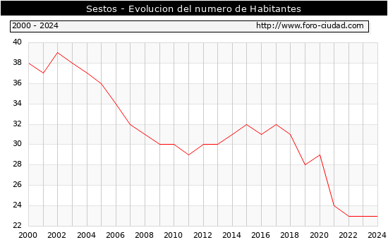 Segun los datos publicados por el INE a 1 de Enero de 2024 el numero de habitantes en Sestos era de 23, igual numero de habitantes que el en el año 2023. En el grafico siguiente se puede ver cuantos habitantes tiene Sestos a lo largo de los años.