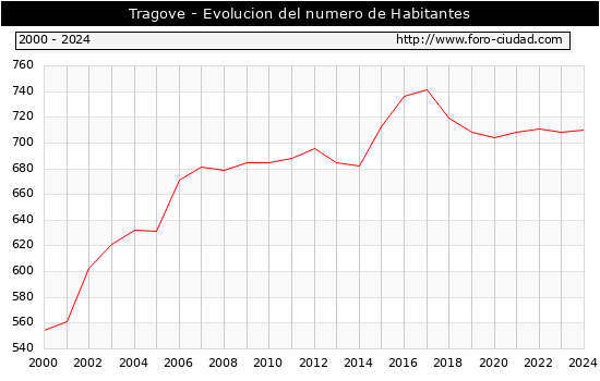 el numero de habitantes en Tragove era de 710, 2 habitantes mas que el en el año 2023. En el grafico siguiente se puede ver cuantos habitantes tiene Tragove a lo largo de los años.