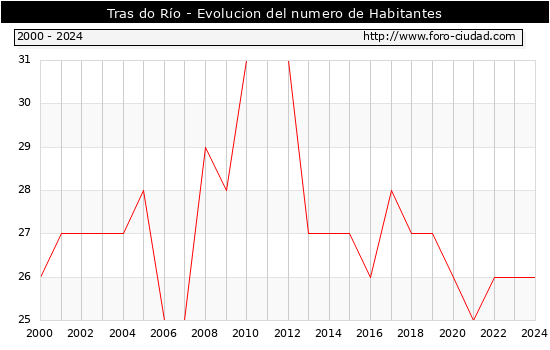 el numero de habitantes en Tras do Río era de 26, igual numero de habitantes que el en el año 2023. En el grafico siguiente se puede ver cuantos habitantes tiene Tras do Río a lo largo de los años.