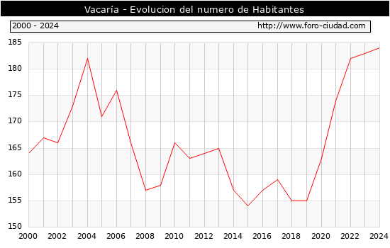 el numero de habitantes en Vacaría era de 184, 1 habitantes mas que el en el año 2023. En el grafico siguiente se puede ver cuantos habitantes tiene Vacaría a lo largo de los años.