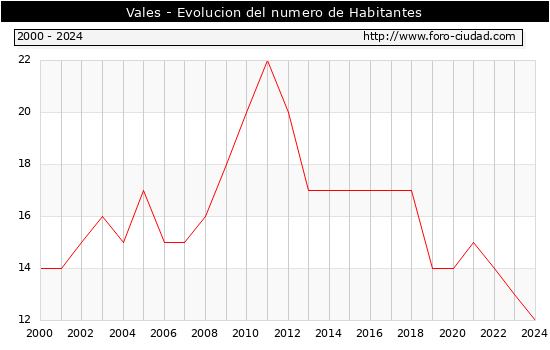 el numero de habitantes en Vales era de 12, 1 habitantes menos que el en el año 2023. En el grafico siguiente se puede ver cuantos habitantes tiene Vales a lo largo de los años.
