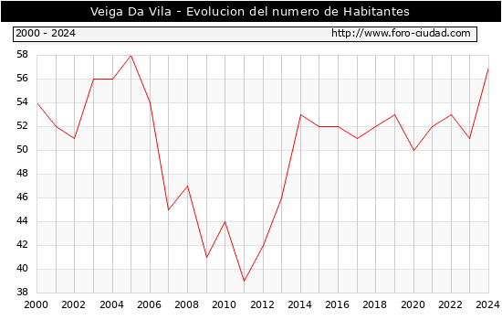 Segun los datos publicados por el INE a 1 de Enero de 2024 el numero de habitantes en Veiga Da Vila era de 57, 6 habitantes mas que el en el año 2023. En el grafico siguiente se puede ver cuantos habitantes tiene Veiga Da Vila a lo largo de los años.