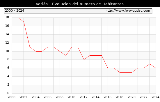 el numero de habitantes en Verlás era de 6, 1 habitantes menos que el en el año 2023. En el grafico siguiente se puede ver cuantos habitantes tiene Verlás a lo largo de los años.