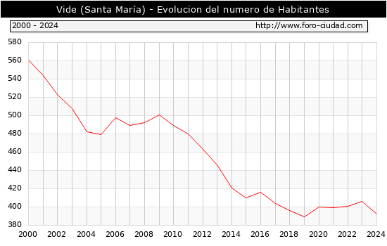 el numero de habitantes en Vide (Santa María) era de 392, 14 habitantes menos que el en el año 2023. En el grafico siguiente se puede ver cuantos habitantes tiene Vide (Santa María) a lo largo de los años.