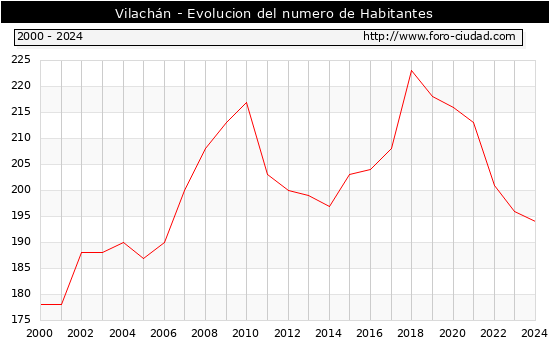el numero de habitantes en Vilachán era de 194, 2 habitantes menos que el en el ańo 2023. En el grafico siguiente se puede ver cuantos habitantes tiene Vilachán a lo largo de los ańos.