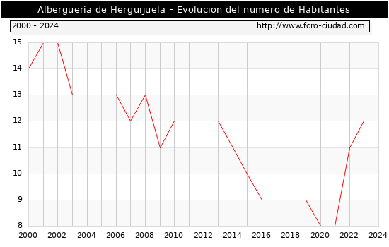 el numero de habitantes en Alberguería de Herguijuela era de 12, igual numero de habitantes que el en el año 2023. En el grafico siguiente se puede ver cuantos habitantes tiene Alberguería de Herguijuela a lo largo de los años.