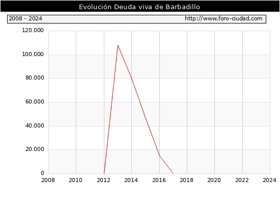 | Barbadillo - Deuda viva del Ayuntamiento a 31/12/2024 Barbadillo - Deuda viva del Ayuntamiento a 31/12/2024 Segun el Ministerio de Economia y Hacienda el Ayuntamiento de Barbadillo a 31/12/2024 posee una deuda de 0 € . La deuda viva a 31/12/2023 ascendia a 0 € por lo que en el ultimo año la deuda se mantuvo igual.