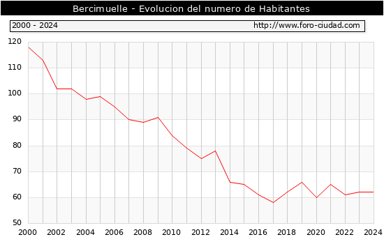 el numero de habitantes en Bercimuelle era de 62, igual numero de habitantes que el en el año 2023. En el grafico siguiente se puede ver cuantos habitantes tiene Bercimuelle a lo largo de los años.
