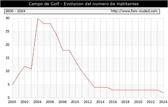 el numero de habitantes en Campo de Golf era de 2, 1 habitantes menos que el en el año 2023. En el grafico siguiente se puede ver cuantos habitantes tiene Campo de Golf a lo largo de los años.