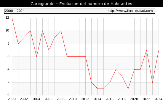 el numero de habitantes en Garcigrande era de 7, 5 habitantes mas que el en el año 2023. En el grafico siguiente se puede ver cuantos habitantes tiene Garcigrande a lo largo de los años.