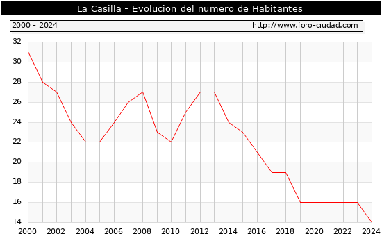el numero de habitantes en La Casilla era de 14, 2 habitantes menos que el en el año 2023. En el grafico siguiente se puede ver cuantos habitantes tiene La Casilla a lo largo de los años.