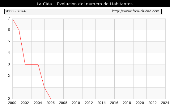 el numero de habitantes en La Cida era de 0, igual numero de habitantes que el en el año 2023. En el grafico siguiente se puede ver cuantos habitantes tiene La Cida a lo largo de los años.
