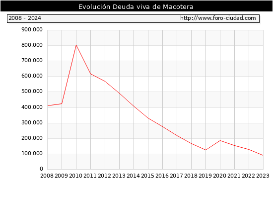Macotera - Deuda viva del Ayuntamiento a 31/12/2024 Macotera - Deuda viva del Ayuntamiento a 31/12/2024 Segun el Ministerio de Economia y Hacienda el Ayuntamiento de Macotera a 31/12/2024 posee una deuda de 77.000 € . La deuda viva a 31/12/2023 ascendia a 89.000 € por lo que en el ultimo año la deuda se redujo en -12.000 €. ![]()