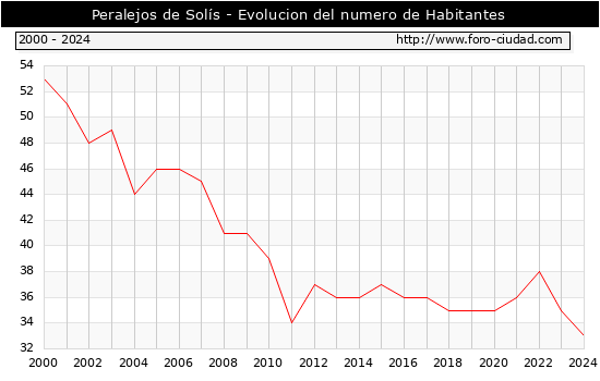 el numero de habitantes en Peralejos de Solís era de 33, 2 habitantes menos que el en el año 2023. En el grafico siguiente se puede ver cuantos habitantes tiene Peralejos de Solís a lo largo de los años.