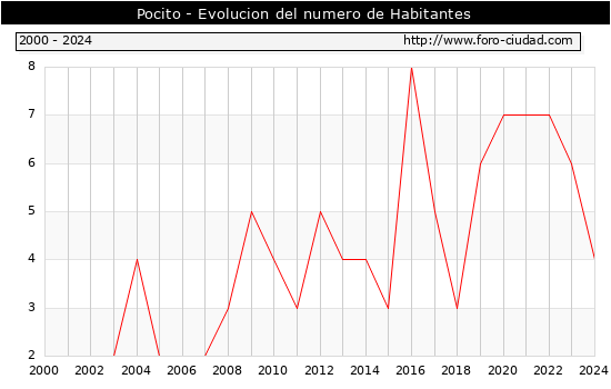 Segun los datos publicados por el INE a 1 de Enero de 2024 el numero de habitantes en Pocito era de 4, 2 habitantes menos que el en el año 2023. En el grafico siguiente se puede ver cuantos habitantes tiene Pocito a lo largo de los años.