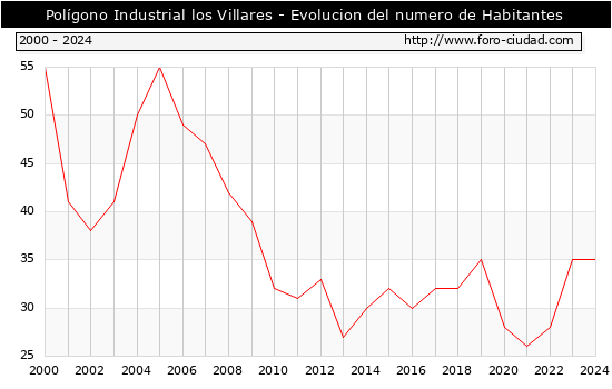 el numero de habitantes en Polígono Industrial los Villares era de 35, igual numero de habitantes que el en el año 2023. En el grafico siguiente se puede ver cuantos habitantes tiene Polígono Industrial los Villares a lo largo de los años.