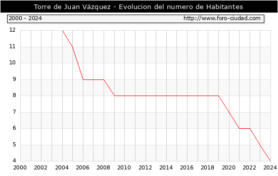 el numero de habitantes en Torre de Juan Vázquez era de 4, 1 habitantes menos que el en el año 2023. En el grafico siguiente se puede ver cuantos habitantes tiene Torre de Juan Vázquez a lo largo de los años.