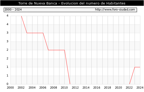 Segun los datos publicados por el INE a 1 de Enero de 2024 el numero de habitantes en Torre de Nueva Banca era de 1, igual numero de habitantes que el en el año 2023. En el grafico siguiente se puede ver cuantos habitantes tiene Torre de Nueva Banca a lo largo de los años.