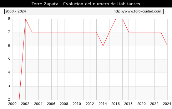 el numero de habitantes en Torre Zapata era de 6, 1 habitantes menos que el en el año 2023. En el grafico siguiente se puede ver cuantos habitantes tiene Torre Zapata a lo largo de los años.