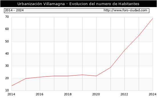 el numero de habitantes en Urbanización Villamagna era de 69, 14 habitantes mas que el en el año 2023. En el grafico siguiente se puede ver cuantos habitantes tiene Urbanización Villamagna a lo largo de los años.