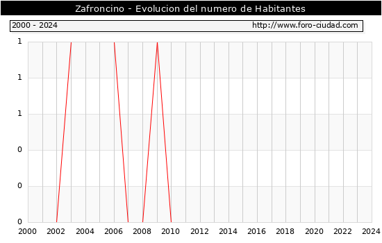 Segun los datos publicados por el INE a 1 de Enero de 2024 el numero de habitantes en Zafroncino era de 0, igual numero de habitantes que el en el año 2023. En el grafico siguiente se puede ver cuantos habitantes tiene Zafroncino a lo largo de los años.