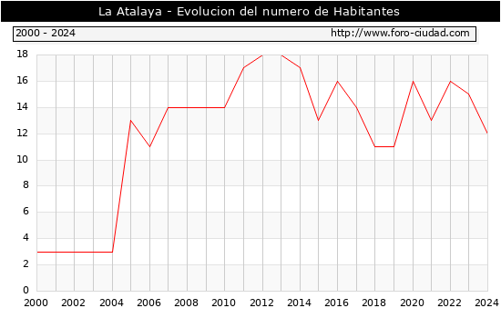 el numero de habitantes en La Atalaya era de 12, 3 habitantes menos que el en el año 2023. En el grafico siguiente se puede ver cuantos habitantes tiene La Atalaya a lo largo de los años.