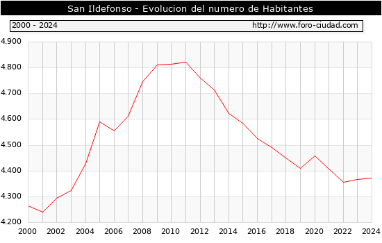 el numero de habitantes en San Ildefonso era de 4.373, 5 habitantes mas que el en el año 2023. En el grafico siguiente se puede ver cuantos habitantes tiene San Ildefonso a lo largo de los años.