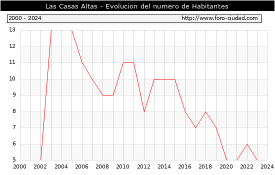 el numero de habitantes en Las Casas Altas era de 5, igual numero de habitantes que el en el año 2023. En el grafico siguiente se puede ver cuantos habitantes tiene Las Casas Altas a lo largo de los años.