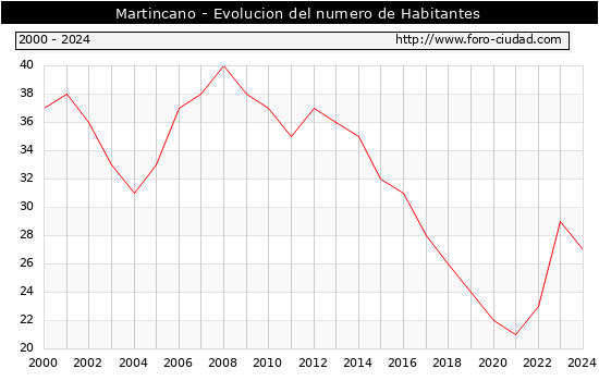 el numero de habitantes en Martincano era de 27, 2 habitantes menos que el en el año 2023. En el grafico siguiente se puede ver cuantos habitantes tiene Martincano a lo largo de los años.