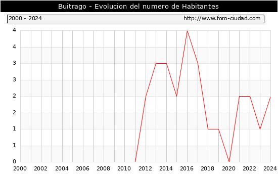 el numero de habitantes en Buitrago era de 2, 1 habitantes mas que el en el año 2023. En el grafico siguiente se puede ver cuantos habitantes tiene Buitrago a lo largo de los años.
