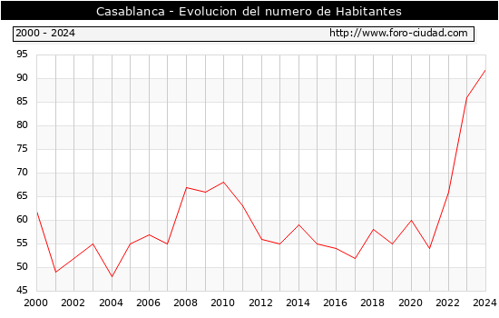el numero de habitantes en Casablanca era de 92, 6 habitantes mas que el en el año 2023. En el grafico siguiente se puede ver cuantos habitantes tiene Casablanca a lo largo de los años.