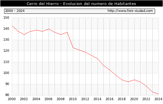 el numero de habitantes en Cerro del Hierro era de 81, 2 habitantes menos que el en el año 2023. En el grafico siguiente se puede ver cuantos habitantes tiene Cerro del Hierro a lo largo de los años.