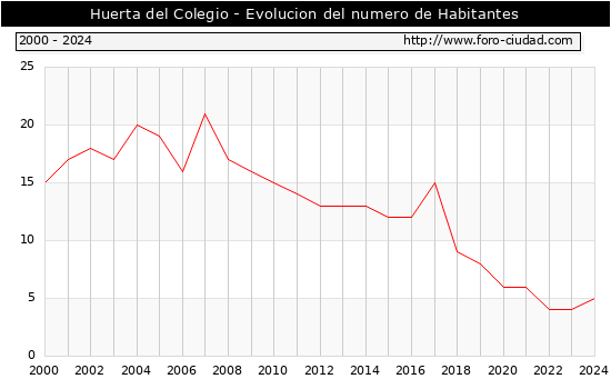 Segun los datos publicados por el INE a 1 de Enero de 2024 el numero de habitantes en Huerta del Colegio era de 5, 1 habitantes mas que el en el año 2023. En el grafico siguiente se puede ver cuantos habitantes tiene Huerta del Colegio a lo largo de los años.