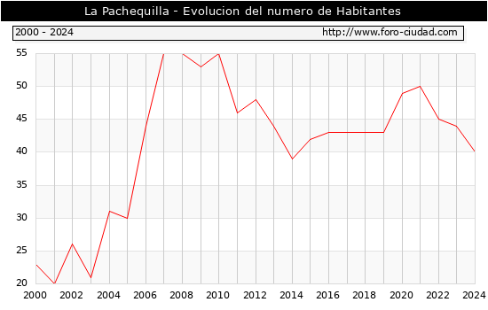 el numero de habitantes en La Pachequilla era de 40, 4 habitantes menos que el en el año 2023. En el grafico siguiente se puede ver cuantos habitantes tiene La Pachequilla a lo largo de los años.
