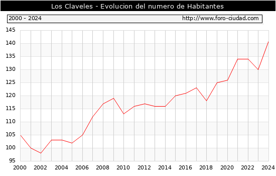 el numero de habitantes en Los Claveles era de 141, 11 habitantes mas que el en el año 2023. En el grafico siguiente se puede ver cuantos habitantes tiene Los Claveles a lo largo de los años.