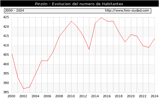 el numero de habitantes en Pinzón era de 414, 5 habitantes mas que el en el año 2023. En el grafico siguiente se puede ver cuantos habitantes tiene Pinzón a lo largo de los años.