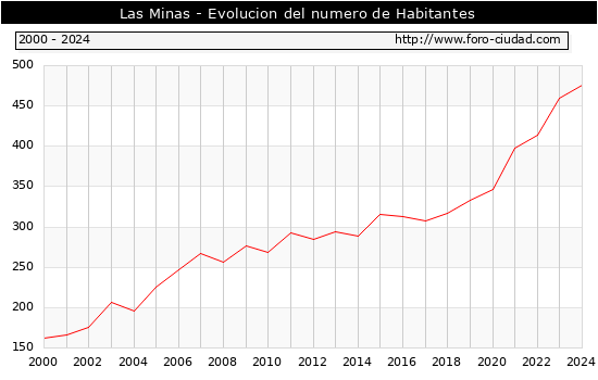 el numero de habitantes en Las Minas era de 476, 16 habitantes mas que el en el año 2023. En el grafico siguiente se puede ver cuantos habitantes tiene Las Minas a lo largo de los años.