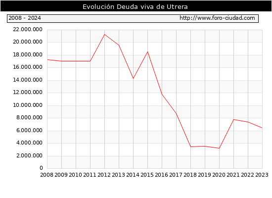 | Utrera - Deuda viva del Ayuntamiento a 31/12/2024 Utrera - Deuda viva del Ayuntamiento a 31/12/2024 Segun el Ministerio de Economia y Hacienda el Ayuntamiento de Utrera a 31/12/2024 posee una deuda de 7.569.000 € . La deuda viva a 31/12/2023 ascendia a 6.418.000 € por lo que en el ultimo año la deuda crecio en 1.151.000 €.
