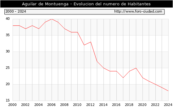 el numero de habitantes en Aguilar de Montuenga era de 18, 1 habitantes menos que el en el año 2023. En el grafico siguiente se puede ver cuantos habitantes tiene Aguilar de Montuenga a lo largo de los años.