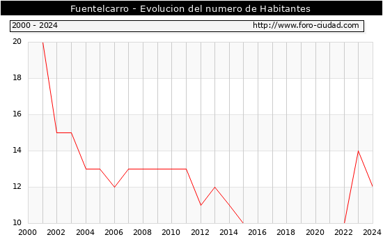el numero de habitantes en Fuentelcarro era de 12, 2 habitantes menos que el en el año 2023. En el grafico siguiente se puede ver cuantos habitantes tiene Fuentelcarro a lo largo de los años.